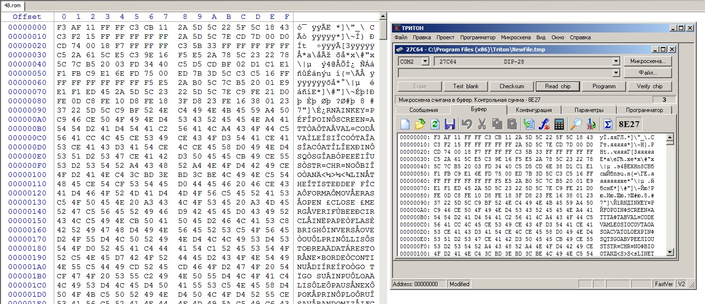 с ПЗУ -шками, я их зашивал и проверял на чтение. В первой та что ближе к процессору прошита первая часть стандартной прошивки 48k .. во второй слева вторая часть..