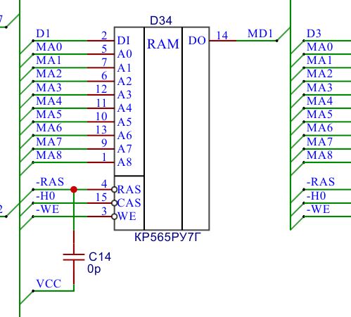 Romych, Нашел К155ИМ3, запаял, преобразователь на 12В заработал. Сам комп так и не стартует. Что-то меняется при касании щупа осциллографа сигнала RAS на 4 ножках РУ7 - влияние емкости щупа. Не понятен этот участок схемы - что за конденсатор и его подключение (см. фото).