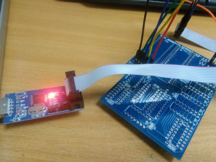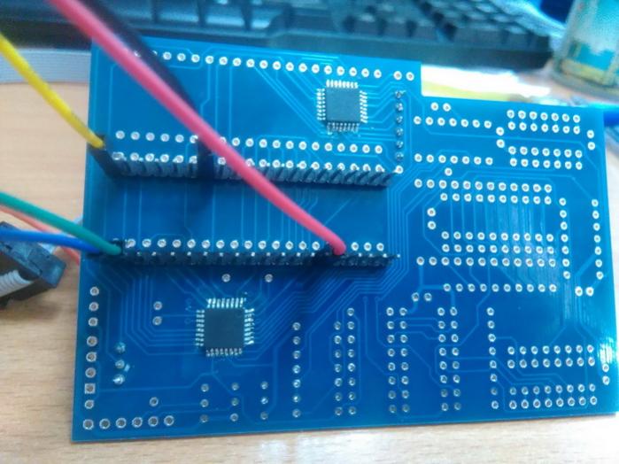 Начал собирать детали на плату расширения, запаял штыри стыковки с основной платой и ВВ55, еще штырьки необходимые для прошивки Атмег8. Запаял контроллеры и прошил оба. Вот фото для понятия процесса прошивки.