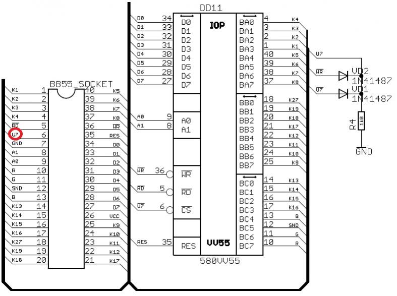 На 6 штырёк должен идти сигнал /U7, а не U7. Ошибка трудноустранимая. Потому что у нас впаиваются штырьки для снятия сигналов с ВВ55 с основной платы и с обратной стороны панелька под ВВ55 (или кто-то впаяет ВВ55 без панельки). Нужно будет впаивать маленький одножильный проводок между DD11 и штырьками выводов 6.