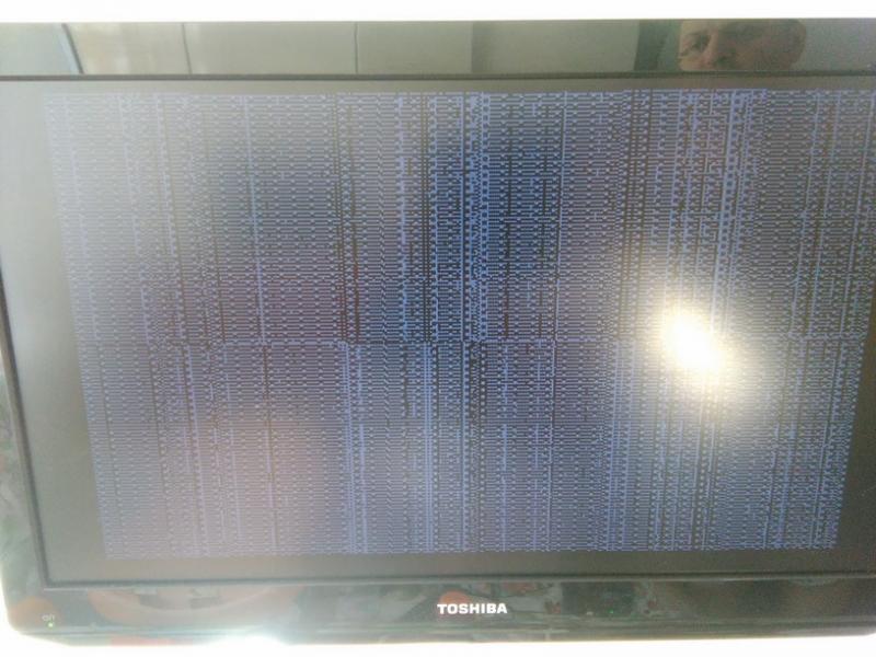Очередная попытка включения с платой расширения. Вот такой экран и всё. Адаптер PS/2 клавиатуры выдаёт реакцию нажатия на Delete - формирование сброса. Светодиод SD интерфейса при сбросе кратковременно включается - наверное SD интерфейс запускается и моргает светодиодом. Наверное попытка заменить К589ИР12 на ИР22 не вполне удачна, по крайней мере я думаю что такой статичный экран выдаёт новый регистр.