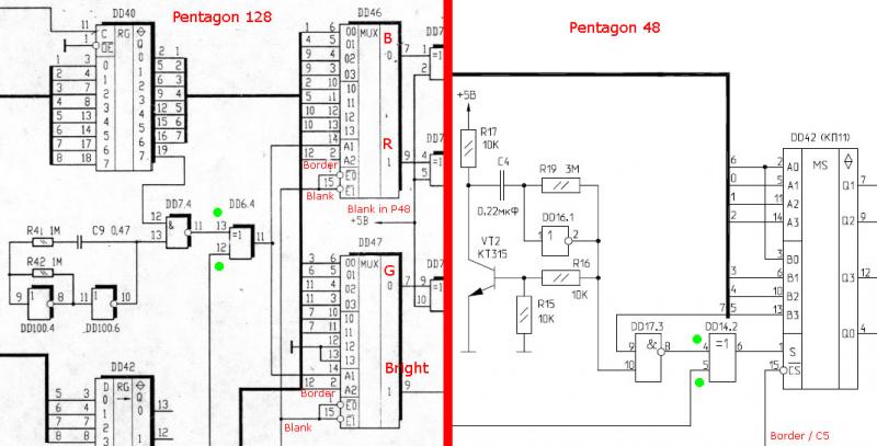 Try this way, but I think some fixes are necessary. The schematic diagram of the Pentagon 48 is very different in this part from the Pentagon-1024 or the GRM1.