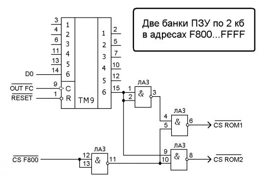 Кстати, ещё нужна доработка отключающая ПЗУ и В/У вообще (FULL RAM). Управление этим делается уже не портом FB, а портом FC по биту D6 с помощью ЛИ1 включённого в разрыв цепи на входе DD14.2/13.