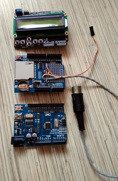 В прошедшие выходные получил посылку с известного китайского сайта, заказывал "Data Logger Shield" с ардуиной уно -- этот шилд как раз подходит для ROM-плеера, есть место, куда можно впаять схему выхода и разъём, плюс бонусом имеет на борту часы. Вот что сейчас имеем: