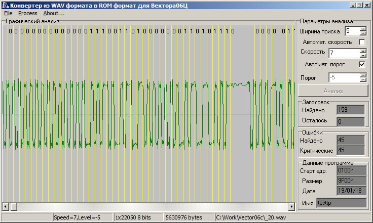 Для проверки взял один из самых больших ROM-файлов, игру Cybernoid, на выгрузку ушло примерно 4 минуты. Всё, вроде, отработало здорово, но при распознавании в wav2rom вылезло 45 ошибок. :-( Причём все ошибки в первом байте блока (не каждого -- в 45 из 159 блоков):