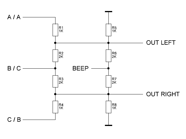 Выпаиваешь A, B, C выходы AY из платы (это сложно, я просто надкусил) и подключаешь их к входам A/A, B/C, C/B схемы (ABC раскладка каналов принята у нас, а ACB у санкционеров, но когда навесом размещаешь резисторы над поверхностью AY, то она конкретно сама напрашивается), отрезаешь на плате проводник от гнезда AUDIO OUT (на корпусе подписан как SOUND) и подаёшь этот проводник на вход BEEP схемы, а OUT LEFT и OUT RIGHT схемы подключаешь к тому самому гнезду AUDIO OUT. Получаешь нормальный стерео выход с подмешанным спикером.