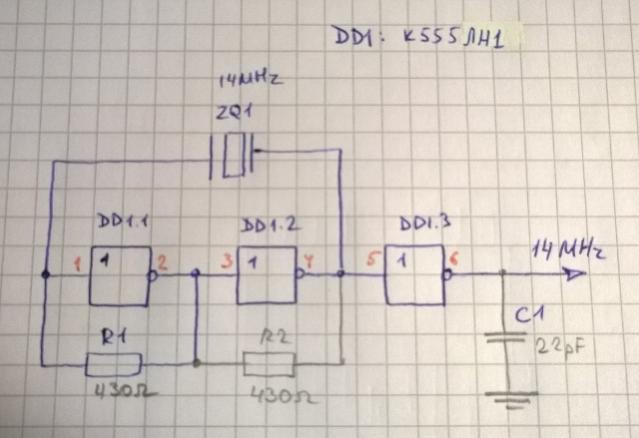 По умолчанию Генератор 14МГц на К555ЛН1 (DD1) и возможный резистор стабилизации R2