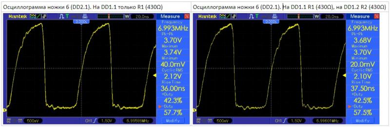 * На выход 6 DD1.3 (К555ЛН1) припаял конденсатор 22pF. Вот что получилось с R1(430Ω), R2(430Ω) и этим конденсатором (22pF):