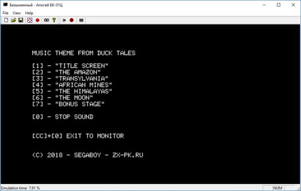 Вариант музыкального проигрывателя SegaBoyя для Партнера с МЦПГ. Рассчитан под текущие конфигурации эмуляторов (ВИ53 2 МГц). Если вдруг выяснится, что частота другая - можно будет поправить.