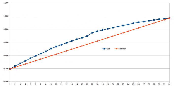 Попытался прикинуть в электронной таблице что там на выходе видео ЦАПа зеленого цвета должно получаться в зависимости от кода (считая, что на выходе АП5 при "0" - 0.5В, а при "1" - 2.5В):