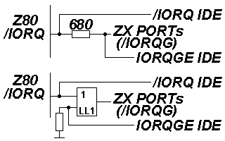 Ваши действия я понял:вместо /IORQGR IDE (на этой схемке) проинвертированный сигнал с 9 ноги ИД7,на другой вход ЛЛ1 подать /IORQ от Z80 а выход с ЛЛ1 который ZXPORTs /IORQGR IDE завели на схему компьютера.