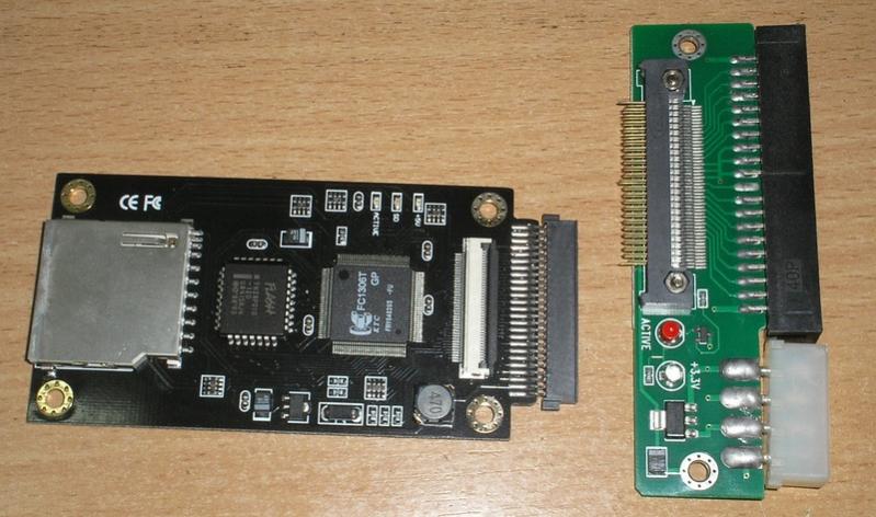А: Запросто. Есть два пути. Первый из них подходит суровым джедаям, которые готовы запаять на шину 155ТМ9 в качестве порта ввода/вывода и дополнить её согласователем уровней 5-3.3 Вольта, а также серьёзно перелопатить биос (а также ПЗУ) на тему написания драйвера. При этом возможно, что размер биоса слегонца возрастёт и придется дополнительно править ещё кучу исходников, к тому же уменьшится объём доступной памяти. Поэтому даже самые отмороженные джедаи прикидываются юными падаванами и для таких проще приобрести переходник IDE-SD, что представлен на фото ниже. Все программные фишки уже за вас написаны и работа с SD/MMC ничем не отличается от уже привычной. Да, а вот сюда питание придётся подавать отдельным кабелем.