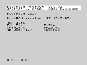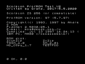 Во вложении - тест-программа, выводящая на экран информацию об имеющемся в компьютере ПрофПЗУ (код версии, дата компиляции), а также каталог ROM-диска. Ее можно запускать на Скорпионе и в режиме 48K, но, так как в этом случае будут доступны не все страницы ROM, информация на экране, возможно, будет не полной. Если ПрофПЗУ нет, будет выдано: ProfROM not present. Наконец, если запустить этот тест не на Скорпионе, то произойдет возврат в BASIC с сообщением "Q Paremeter error".