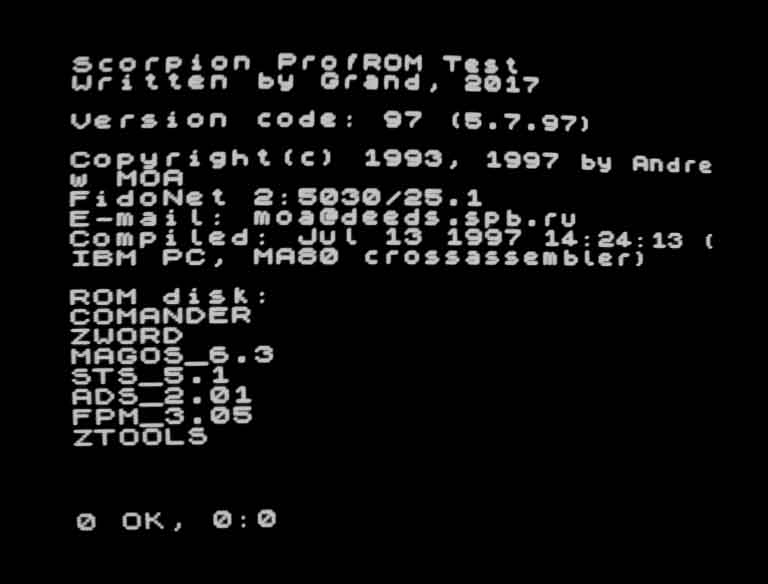 В последней тестовой версии сделан прямой вызов громозкой процедуры подсчета CRC из ПрофПЗУ 4.01; с другими версиями ПрофПЗУ она не запустится. Кто нибудь попробовал мою прогу Scorpion ProfROM Test из предыдущего поста. Лучше напишите, какими версиями ПрофПЗУ вы пользуетесь, чтобы мы могли учесть их поддержку. Во вложении скриншот с результатом работы программы с моего реального Скорпиона.