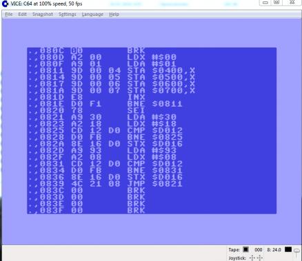 Код заполнения экрана символами с $080d, а с $0820 разделение экрана.