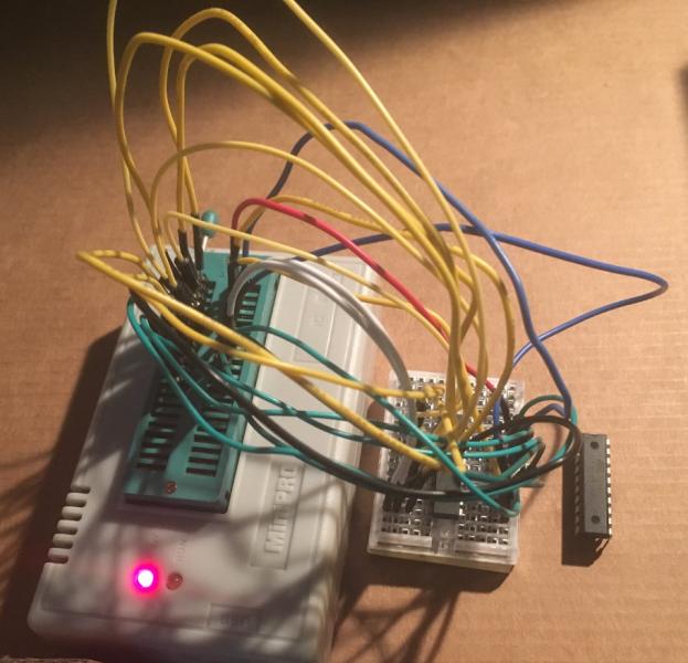 > Теперь я могу сделать прошивку для GAL/ATF и аналогичным образом "прочитать" её содержимое как будто это 4K ПЗУ для того, чтобы убедиться, что всё совпало с ХЛ8...