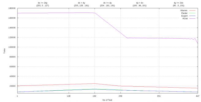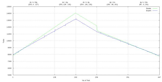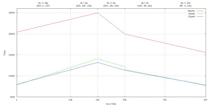 UPDATE: Графики для вертикально и горизонтально ориентированных теперь слиты вместе, для наглядности. По горизонтали отложены номера тестов от 1 до 447 включительно. В тестах 1...192 строятся линии (0,0)-(255, 0...191). В тестах 193...447 -- линии (0,0)-(254...0, 191).
