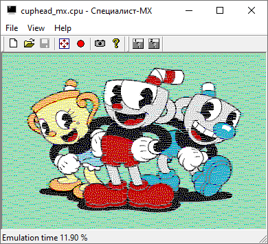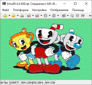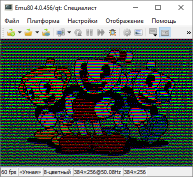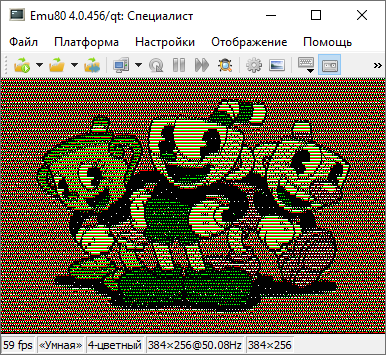 Таким образом получается, что всё-таки коды цветов для белого, красного, зелёного, и синего для компьютеров с 5-ю и 8-ю цветами идентичны! Это видно, если в Emu80 загрузить линейную картинку сохранённую для 5-ти цветной модели и потом на лету переключать режим эмулятор с 5-ти на 8-ми цвет. Ничего не меняется!