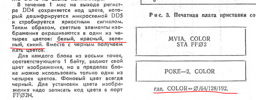 Что, впрочем только породило больше вопросов. Возможно, это эмулятор так по-своему интерпретирует данные. Нужно тестировать на реальном 5-ти цветном компе, которого у меня нет. Предлагаю всё-таки ориентироваться на данные журнала, которые не опровергают и мои тесты.