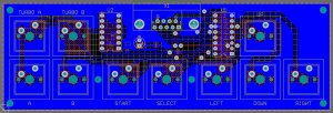 Так как я не люблю джойпады, сделал для "Денди", как его назвал, ButtonPad с кнопками Gateron. Управление поменял местами, получилось что-то типа клавиатуры, курсор - справа, остальное - слева, "старт" и "выбор" остались в центре. К сожалению, при проектировании я не учёл расположения коннектора относительно верхней части, расстояние получилось очень небольшое и ответная часть с кабелем в корпусе просто не вставляется. Проблема решилась использованием переходника-удлинителя, купленного на "Алиэкспрессе". Правда, нужно ещё чуть подточить корпус, так как, всё же, он немного отгибается, но это уже мелочи. Плата односторонняя, с перемычками, изготавливалась на бюджетном станке CNC3018, дорожки резались фрезой, кажется, 0,2мм - за давностью уже подзабыл. Отверстия под контакты кнопок сверлились сверлом 0,9мм, отверстия под перемычки - вроде бы, 0,5мм, остальные отверстия и фрезеровка по периметру - "кукурузой" 1мм.