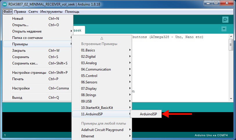 Для превращения Ардуино NANO в программатор, в нее надо «залить» скетч ArduinoISP. Этот скетч есть в стандартном комплекте среды разработки Arduino IDE 1.8.18