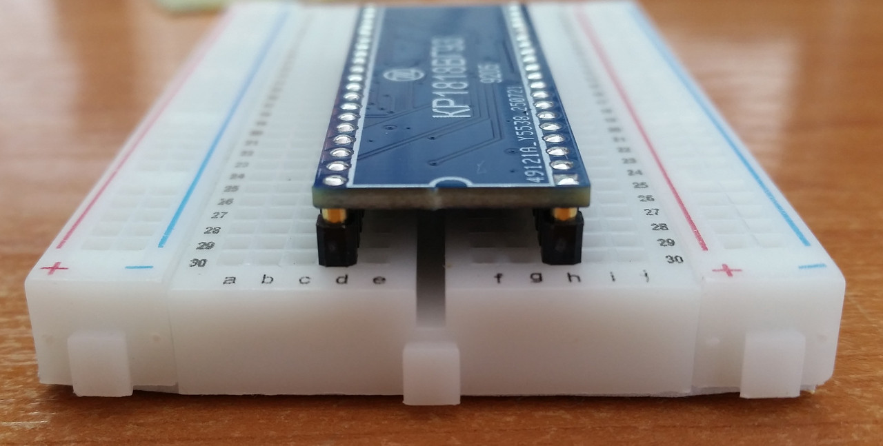 Сначала запаиваем микроконтроллер, потом SMD детали. Контактные «гребенки» паяем в последнюю очередь. Чтобы запаять их ровно я использую макетную плату от Ардуино. Выступающую часть контактов обрезаю заподлицо с платой и формирую при пайке «шарики».