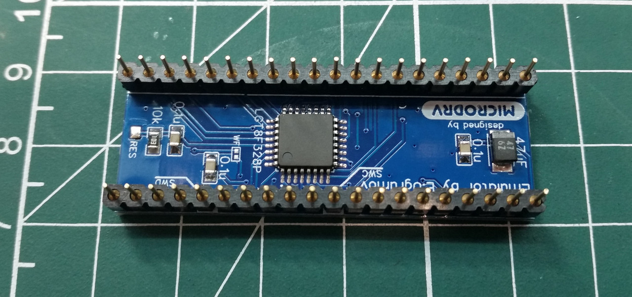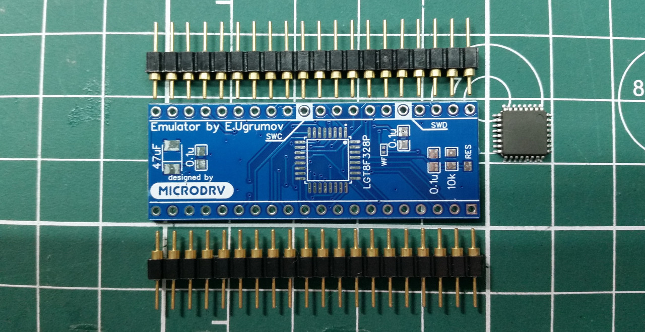 Кроме платы и чипа надо найти «гребенки» для изготовления «ножек» микросхемы эмулятора. Я использую т.н. цанговые панельки, поэтому купил цанговые «гребенки». Кроме этого, надо три блокировочных SMD конденсатора на 0.1uF, танталовый электролитический конденсатор на 47uF, и SMD-резистор на 10 кОм.