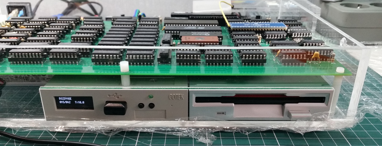 Достал с полочки свой Pentagon 128 (2013). Он сразу оснащен двумя дисководами. Gotek - диск "А", 3.5" FDD - диск "B".
