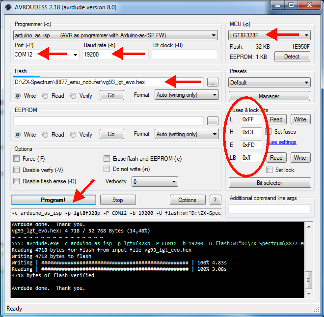 В поле Flash указываем путь к нужному файлу прошивки (для начала залил прошивку vg93_lgt_evo.hex). Файлы прошивок прикреплю ниже, альтернативные прошивки есть в архиве с прошивальщиком AVRDUDESS.