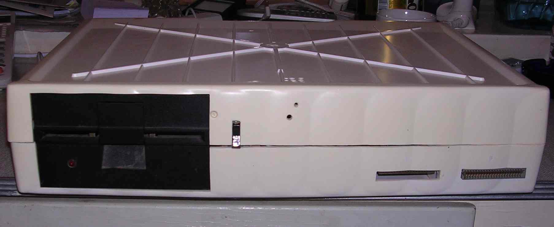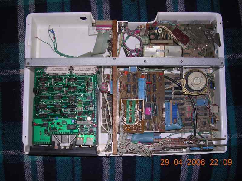 Итак, представляю на опознание самодельный спек в моноблочном корпусе с дисководом EC 5321M и блоком питания (даже с самодельным вентилятором). К нему в комплекте деревянная клавиатура. Год выпуска - вроде как 1989. Спек 128К.