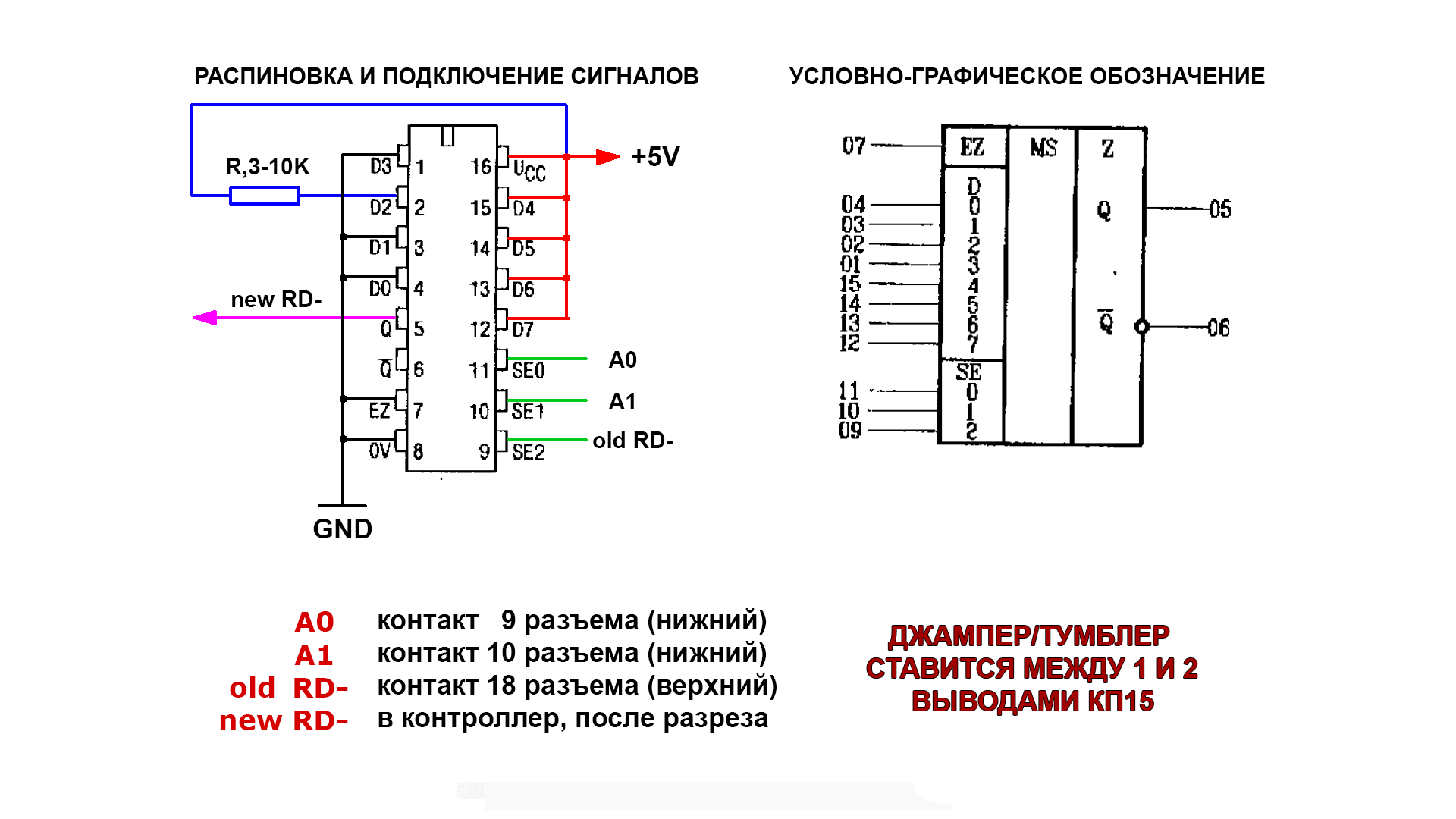 Последний этап - проводки от платы на КП15. Сигнал А0 подаем на 11-й вывод, А1 на 10-й, сигнал RD- от разьема (ниже разреза) на 9-й вывод. Выход с КП15 - с ножки 5 - подаем в схему вместо сигнала RD-, то бишь к контакту ламеля выше разреза. Все, переделка закончена.