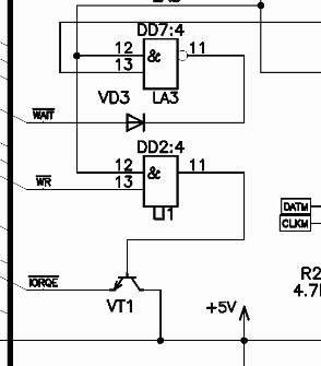 Поставил вентиль для /WAIT, проблема осталась. Вентиль для IORQGE не могу поставить т.к. нет инверсного сигнала. кусок схемы.