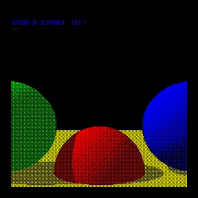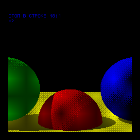 svofski нашел еще один трассировщик лучей, а я адаптировал. Время рисования за счет оптимизации и использования 2.991 сократилось с 17+ часов на спеке до 4 часов 45 минут на векторе. Нельзя сказать, что это однозначный шаг вперед по сравнению с сферами. Там отражения и при более низкой сложности картинка (на мой субъективный взгляд) получается круче. Зато у этого трассировщика за счет выбора цветов и штатного дизера большой потенциал портирования на разные компы (со сферами намного сложнее). Для примера портанул еще и на корвет.