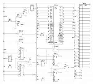 На первый взгляд всё в порядке. Инвертор в цепи F1T/ я заменил с ла3 на ле1, тк ле1 1531 серии для уменьшения задержки клока. Но в варианте 2.5 МГц 1531ЛЕ1 можно полностью исключить, заменив этот инвертор на элемент с ЛА3 и соединив выход ЛА3 F1T c входом CLK Z80. Платку надо делать однозначно на системный разьем, гораздо легче будет устанавливать. Я и все так склоняюсь, к тому что бы сделать посадочные места на платке для AY или дальнейших расширений