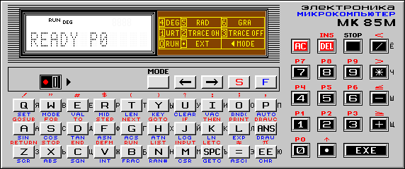 В папке soft некоторые мои программки. Чтобы запустить программу, скопируйте файл RAM.BIN в папку с эмулятором MK85M.exe, запустите эмулятор и нажмите кнопку [S] + [P0]. Программы надо запускать при эмуляции МК85, то есть RamSize=2048.