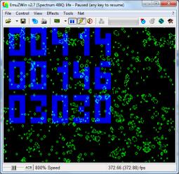 В общем если кому интересно, программка для EmuZWin прилагается, комментарии весьма условные, компилируется она достаточно долго, если лень ждать можно загрузить life.ezx. После компиляции PC нужно установить на 0, сброс программа пережить не может, поскольку таблицы в памяти не вычисляет, а использует те, что получаются при компиляции.