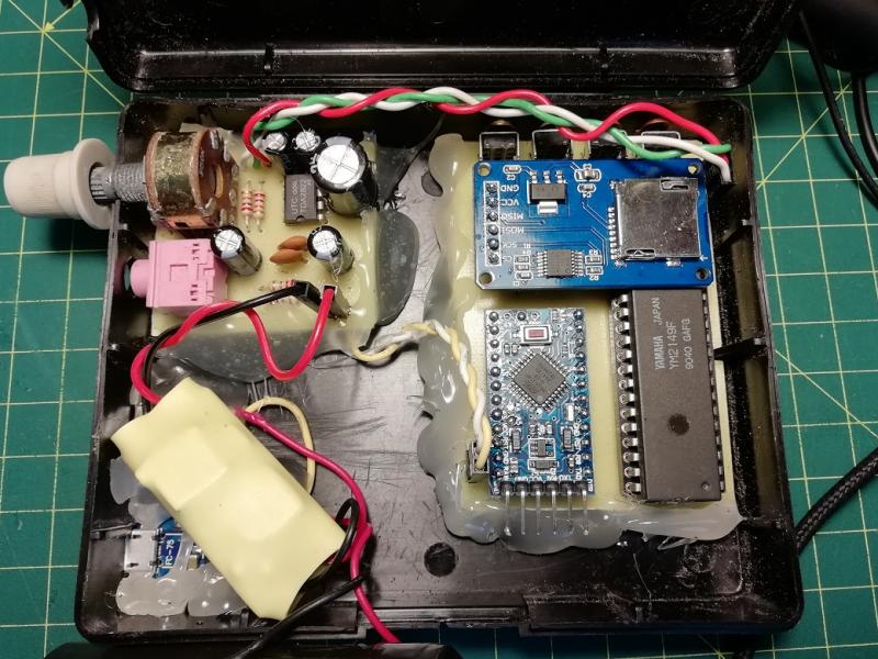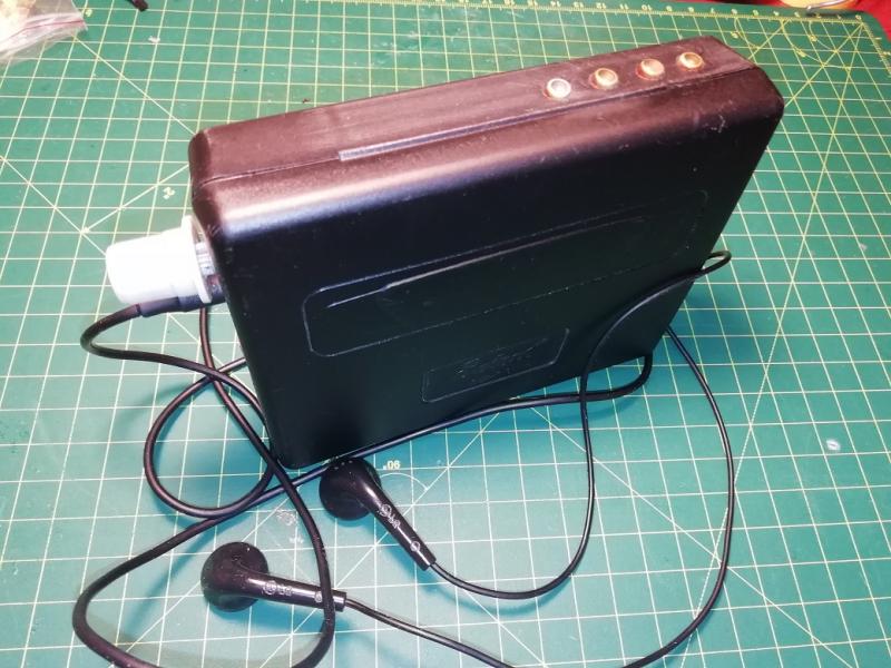 В итоге была найдена подходящая коробочка в которую на термоклей все было впихнуто. Кнопки из старых светодиодов. Повышающий преобразователь и одна банка 18650 с зарядником. В дальнейшем думаю покрасить) Жена говорит на кассетный плеер похож)) Играет уже кучу часов подряд и все не садится.