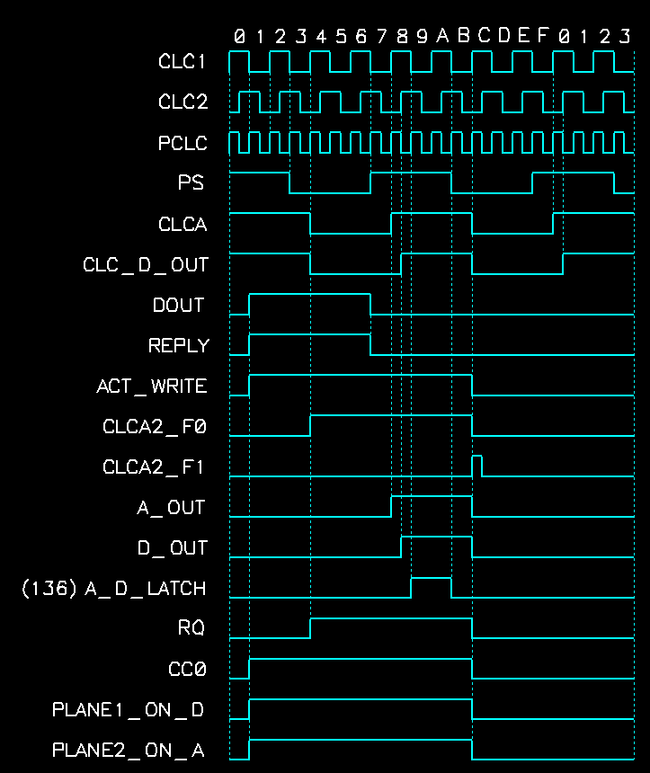 PCLC - тактовый сигнал 12.5МГц (Pixel clock), получаемый из CLC1 и CLC2 внутри большинства чипов. Также является тактовым сигналом видеоконтроллера (ХМ1-136). Один такт PCLC соответствует одной точке экрана в разрешении 640. В дальнейшем тактовым сигналом будет называться именно PCLC.