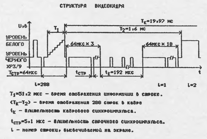 2. Кадровый синхроимпульс нестандартен, наполнен строчными синхроимпульсами условно утроенной частоты с неодинаковым периодом (3 линии).
