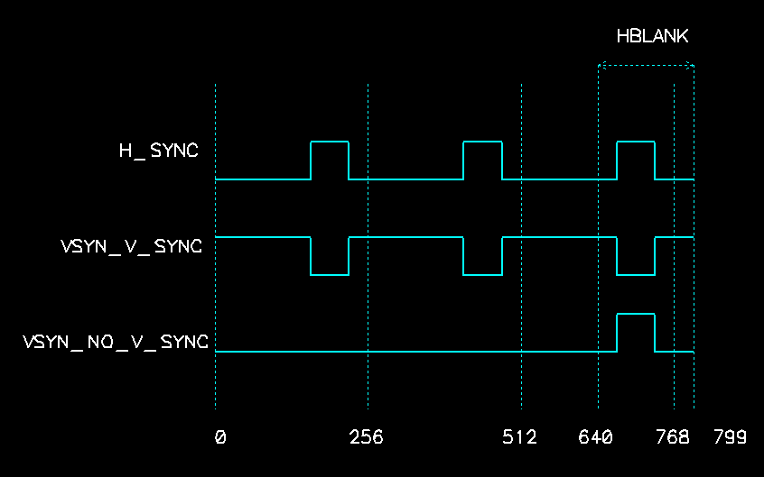 VSYN_NO_V_SYNC - это строчные синхроимпульсы во время всех остальных строк. При этом во время кадрового гасящего импульса (3 линии после экрана, 3 линии кадрового синхроимпульса, 18 линий в начале экрана), нет уравнивающих строчных синхроимпульсов с удвоенной частотой. В принципе, оно и понятно, т.к. это необходимо для чересстрочной развертки, но как к этому отнесутся телевизоры - неизвестно.