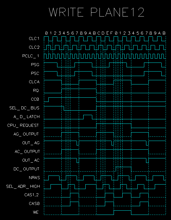 Операция начинается по команде WRITE_PLANE12 (RQ = 1, CC0 = 1, CC1 = 0). Используется при записи в регистр планов 1&2 (PLANE12, адрес 177014), а также при записи в регистр октета (OCTET_MASK, адрес 177024).