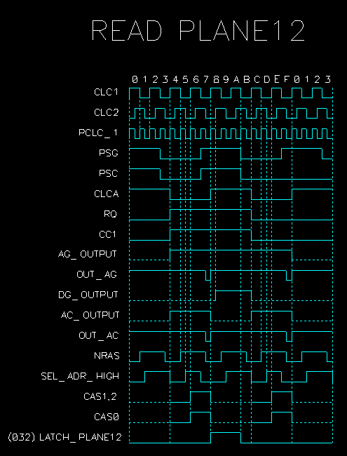 Такт 18 - устанавливаются сигналы CAS1, CAS2, по которым в ОЗУ защелкивается адрес столбца (старшая часть адреса). В течение активного сигнала CAS, данные с шины DC0..DC15 защелкиваются в регистрах DC_H, DC_L, причем, DC_H защелкивается в инверсном виде.