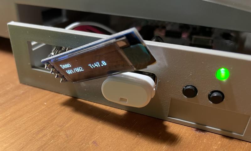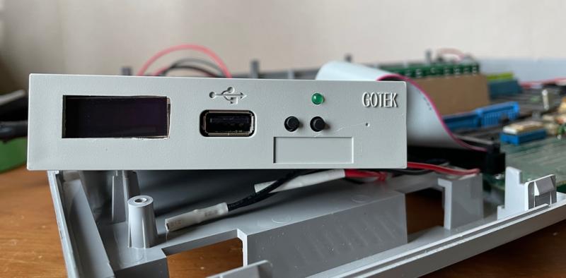 У меня более новая версия Готека на ARM, с ней экран тоже работает. Распайка джампера J7 такая же, как у прошлых версий Gotek. На верхней крышке корпуса есть пластиковая лапка, к которой можно приклеить экран двусторонним скотчем. Идеально ровно не получится, но зато это самый простой и быстрый способ.