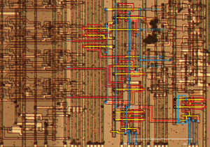 Фото данного чипа без особых проблем позволяет просмотреть топологию интересующего участка даже без снятия металла. Нужен определенный опыт в этом деле разумеется![]()