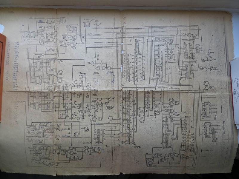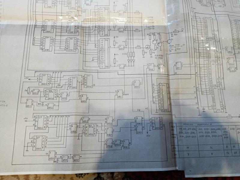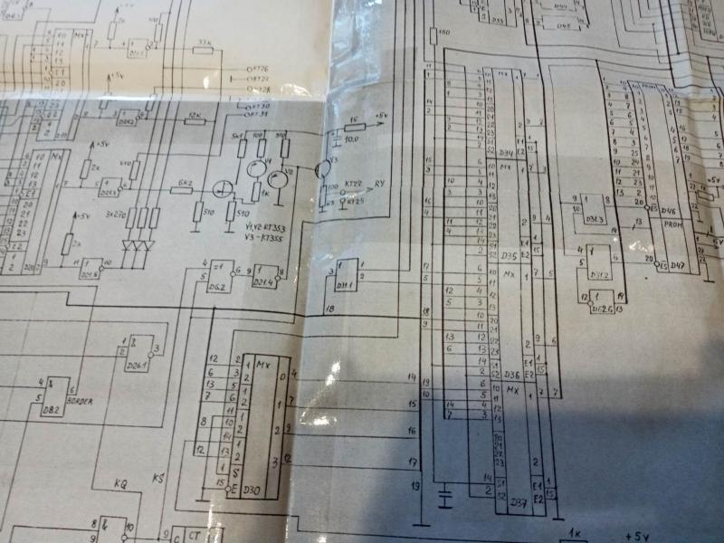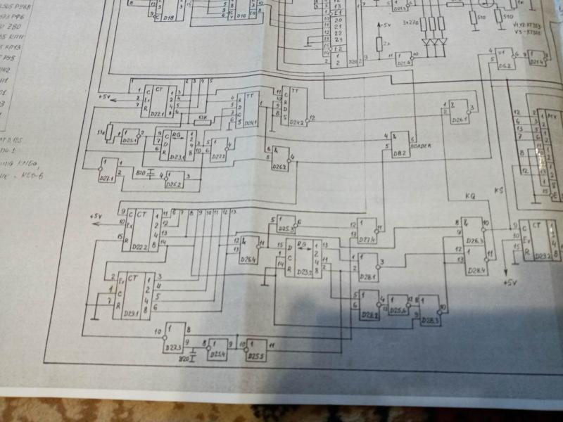 Когда месяц - полтора назад восстанавливал его ,то было двойное изображение (кадровая выше в 2 раза),на форуме как раз нашёл тему с такой неисправностью,подобрали ёмкость на Д22.2 вывод 9 на массу и всё пришло в норму.На моём вообще раньше этой ёмкости не было и показывал,установил 330пф,всё вышло.Сегодня анализируя неисправность(уже всякое в голове)прошёлся осциллом (С1-48Б) по схеме.При касании выв. 5 мультиплексора Д36 экран гаснет,срывается синхр-я,это идёт со счётчика Д22 выв.6(нижний из его 4-х)Касание выводов 3,4,5 такого не вызывает И на выв.5 как игла дополнительная среди импульсов.Проверил этот сигнал,приходит на 3 микросхемы,замыканий не обнаружил,этот сигнал проходит под панельками,(565 ру 5 стоят на панелях(снял пока сегодня)но пока не нашёл ничего подозрительного.Вроде не должно срываться?Ведь это сигнал "бит "16" ,он в каждой строке изображения,а экран в порядке...