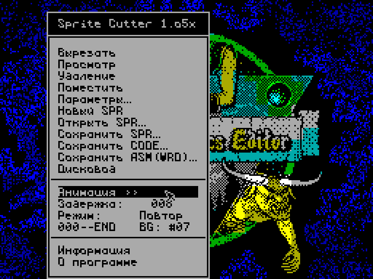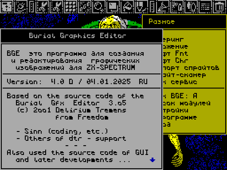 Burial Graphics Editor является редактором стандартной графики для компьютера ZX-SPECTRUM 128 K и выше под TR-DOS.