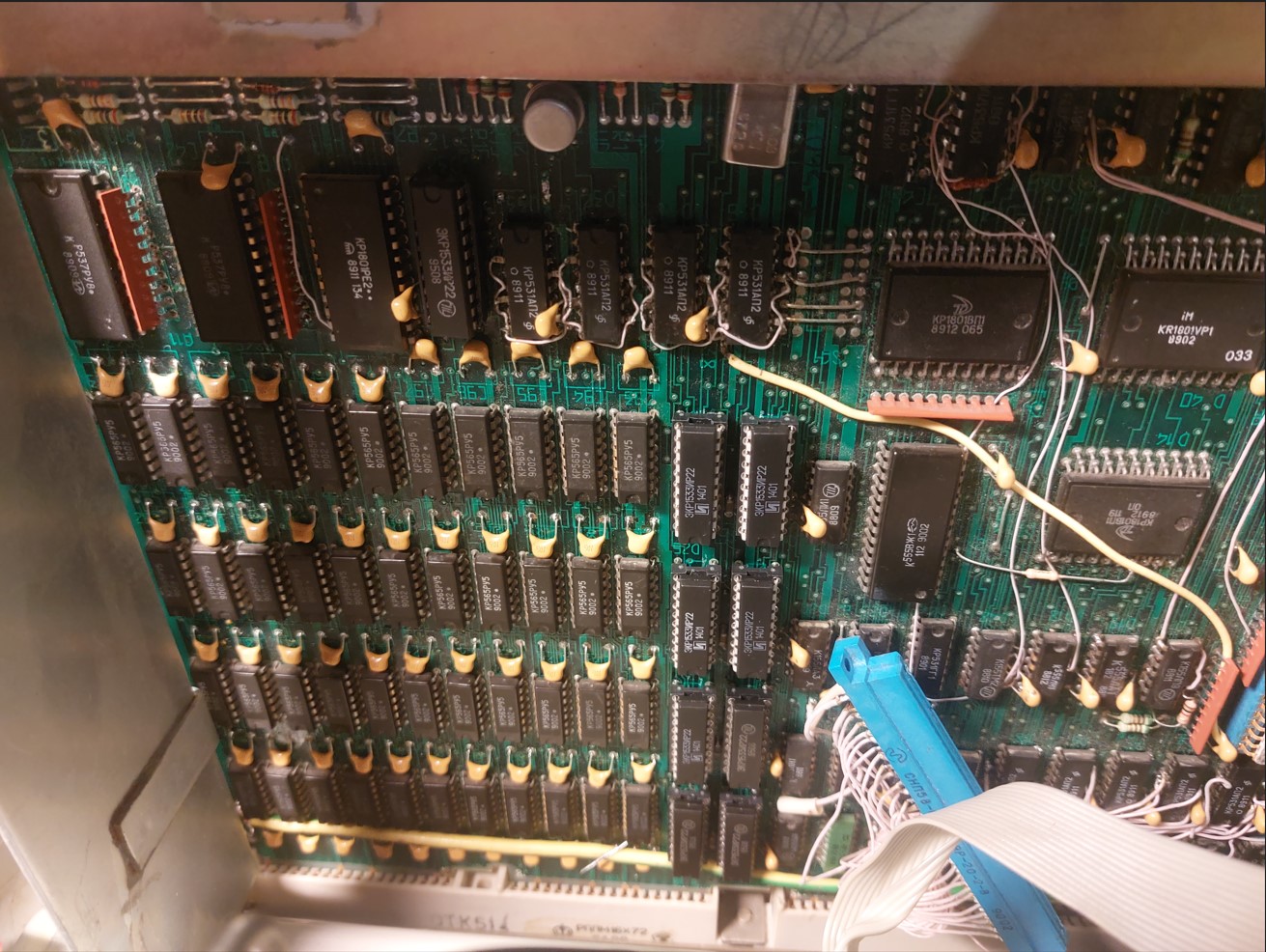 Там пары 531ИР22 стоят как мультиплексоры адреса на память и выходы разрешаются/запрещаются не очень синхронно. Поэтому, на "удачном" адресе там бывают сквозные пички тока, да еще со всей дури 531-ой серии. Именно поэтому на характерных адресах глючит ОЗУ. На одной плате MC1201.03 я заменил на 1533ИР22, они послабее и помедленнее, выходы успевают переключиться корректно, все отлично работает, вообще никаких сбоев по памяти. Есть еще вторая, там родные 531ИР22 стоят, надо будет подключить хороший осциллограф и наглядно показать процесс.