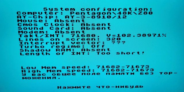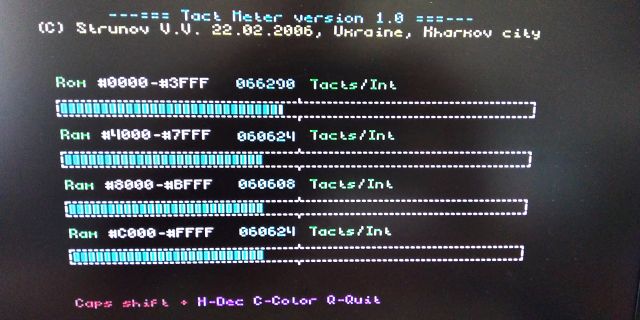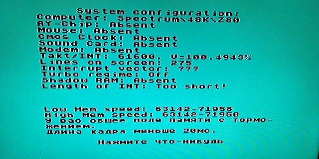 Тогда остается вариант с довольно нестандартными параметрами развертки, кадровая должна быть примерно 52.5 Гц и, соответсвенно, часы в программах, рассчитанных на обычный спектрум должны спешить на полторы минуты за полчаса.