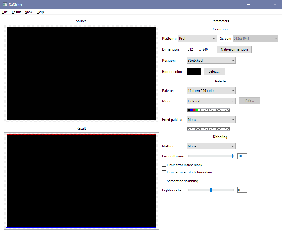 Но и даже в твоём режиме «Stretched», и при отключённом «Dithering» программа ухитрилась накосячить. Что там за алгоритмы, одно корейскому рендому известны.