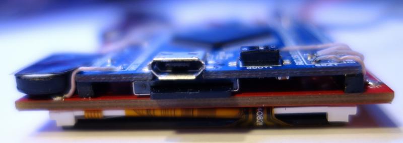Вся штука, толщиной 17мм, включает ВСЁ кроме клавы. Конвертер любое-в-3.3в, динамики, усилитель.